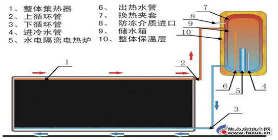 El sistema de agua caliente es una aleta dentro del colector de placa plana que convierte la radiación solar absorbida en energía térmica, de modo que la temperatura del medio de trabajo en el tubo de intercambio de calor del colector aumenta continuamente, y la densidad del líquido caliente es pequeño, y la densidad del líquido frío es grande. A través de la tubería de circulación, se forma agua fría entre el colector y el tanque de agua de arriba hacia abajo, y el agua caliente circula naturalmente de abajo hacia arriba. A través de este ciclo, el agua en el tanque de agua se calienta gradualmente. Dado que el fluido de trabajo en el colector de placa plana es un líquido resistente a baja temperatura, se puede mantener a menos 40 grados sin congelación. Por lo tanto, incluso en la región alpina, puede funcionar normalmente durante todo el año.