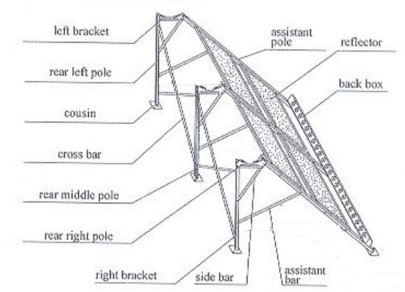 combine el poste auxiliar y el reflector con el perno. Preste más atención para distinguir el soporte izquierdo y el soporte derecho, conecte el soporte y el poste auxiliar, luego instale la barra lateral, la barra auxiliar, la barra niveladora y la barra transversal paso a paso. Sería mejor instalar el primo.